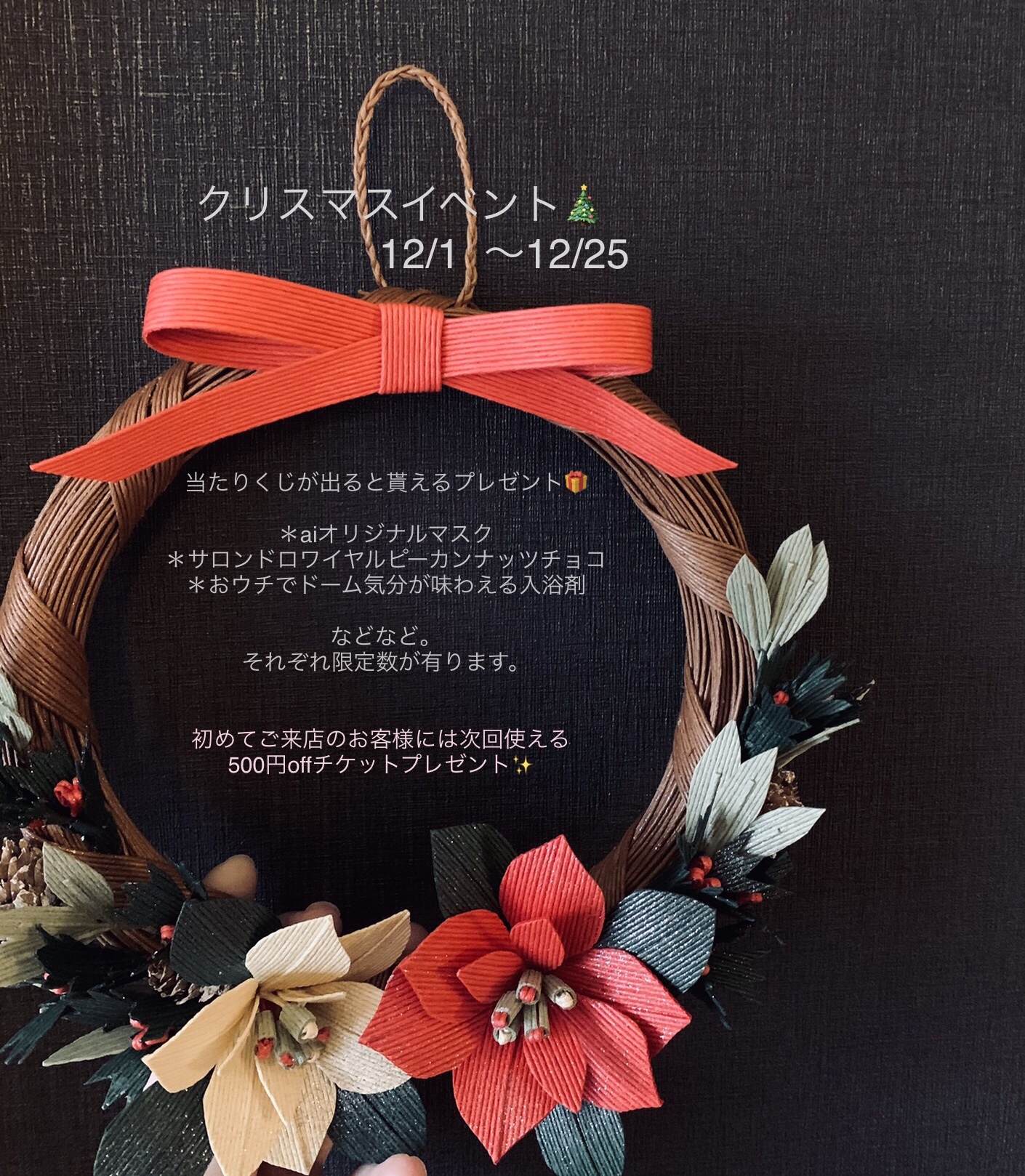 2020年11月28日 / 最終更新日時 : 2020年11月28日 aiko.k イベント クリスマスイベント 12/1~25日までクリスマスイベントを行います。 ご来店のお客様お一人様一回限りくじを引いてくださいませ。 良いものが当たりますように。